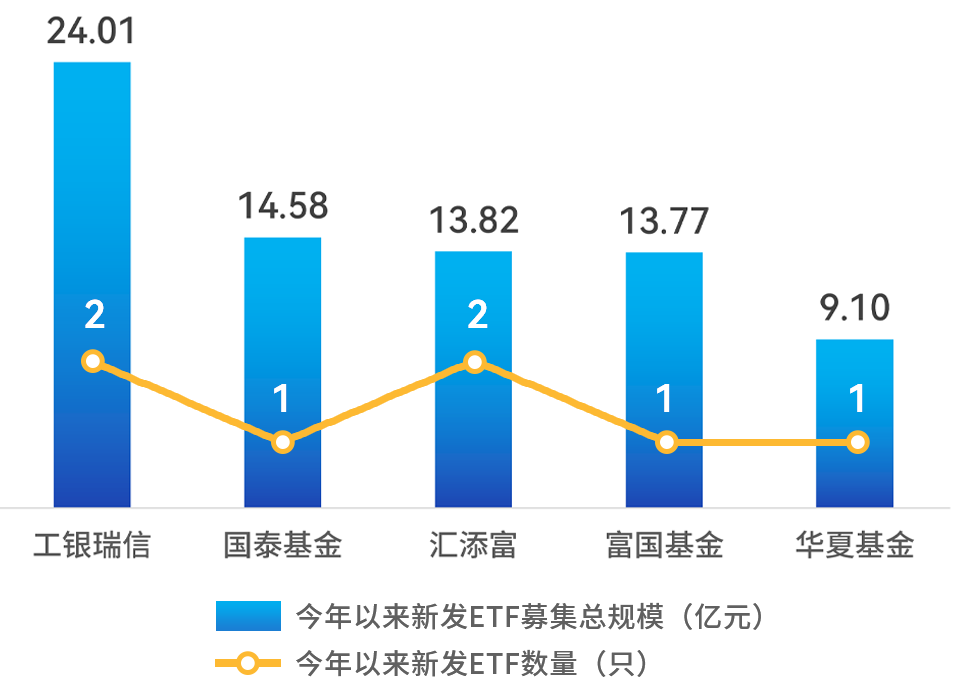 新发ETF方面,工银瑞信基金、国泰基金、汇添富基金、富国基金和华夏基金今年以来深市新发ETF规模居前,分别为24.01亿元、14.58亿元、13.82亿元、13.77亿元和9.10亿元。