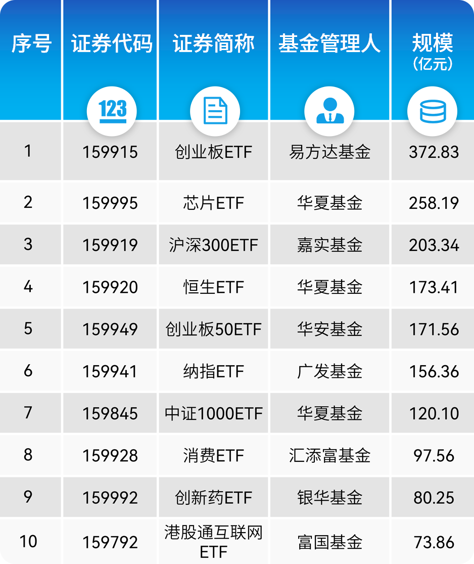 在深市规模排名前十ETF中,多只ETF规模环比增长,涵盖创业板ETF、芯片ETF、创业板50ETF、纳指ETF、中证1000ETF。