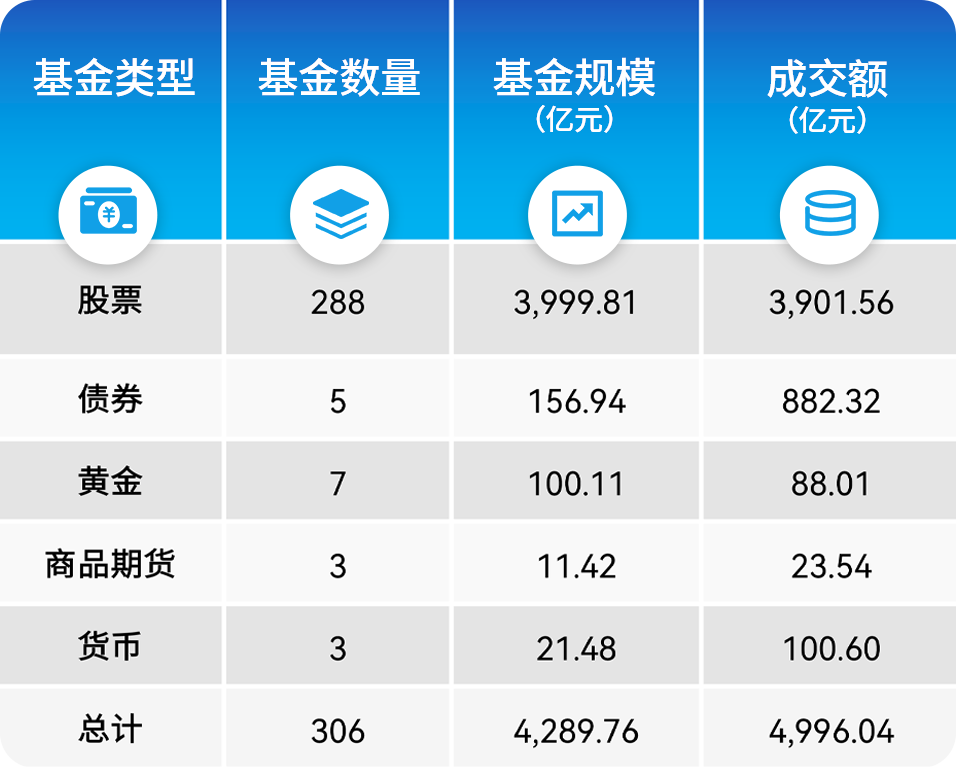 A股ETF中,日均成交额排名前三的分别为:华夏上证科创板50ETF、华泰柏瑞沪深300ETF、国联安中证全指半导体ETF,日均成交额分别为25.83亿元、21.87亿元和17.98亿元。