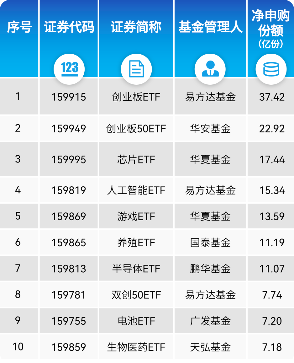 5月净申购份额排名前十的ETF产品还有芯片ETF、人工智能ETF、游戏ETF、养殖ETF、半导体ETF、双创50ETF、电池ETF、生物医药ETF。