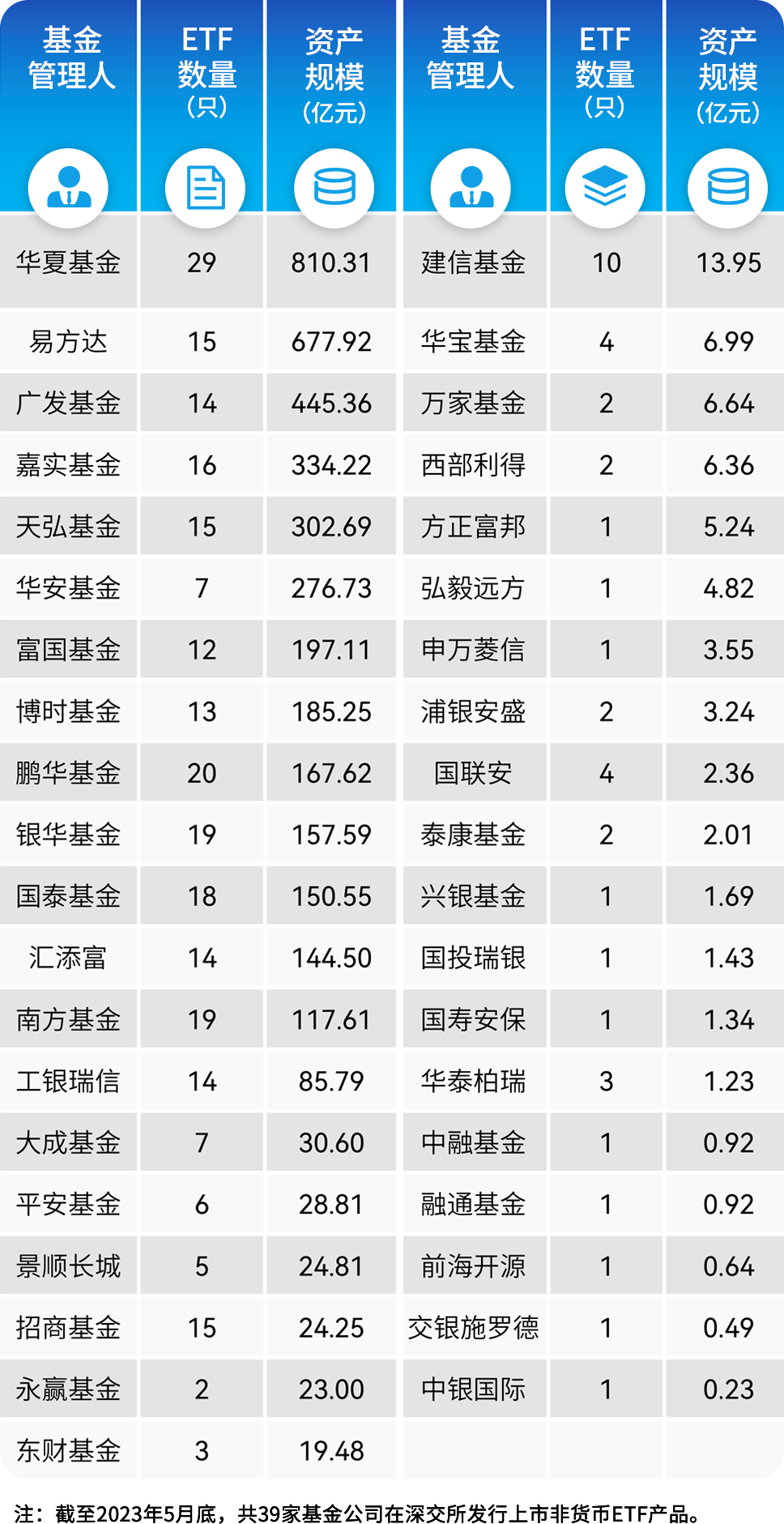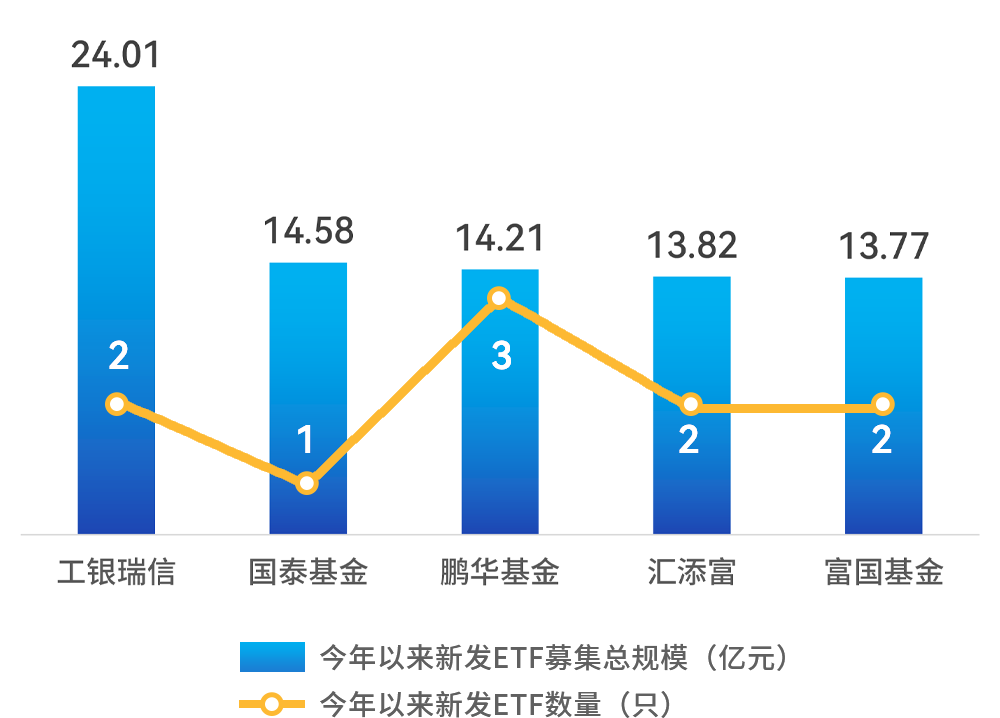 根据深交所基金部数据,截至2023年5月底,工银瑞信基金、国泰基金、鹏华基金、汇添富基金和富国基金今年以来深市新发ETF规模居前,分别为24.01亿元、14.58亿元、14.21亿元、13.82亿元和13.77亿元。