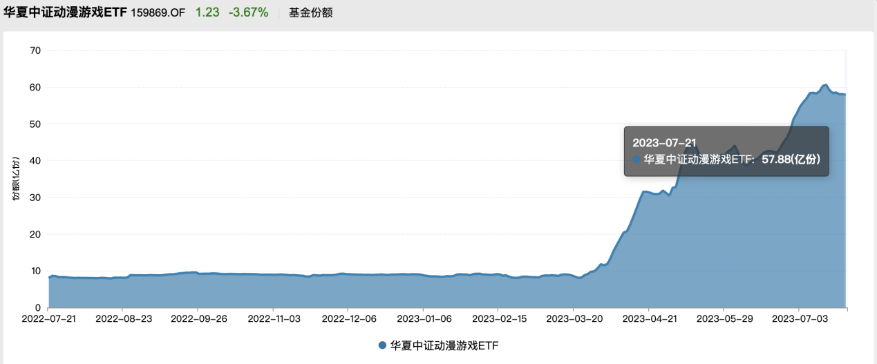 值得一提的是,游戏ETF为榜单新晋成员,其在6月份规模增至80.38亿元,总份额实现大幅增长,净申购份额10.58亿份,在深交所6月净申购份额排名前十榜单中居第六位。自3月底以来,游戏ETF份额便开始步入快速增长阶段,至7月21日总份额已达57.88亿份。