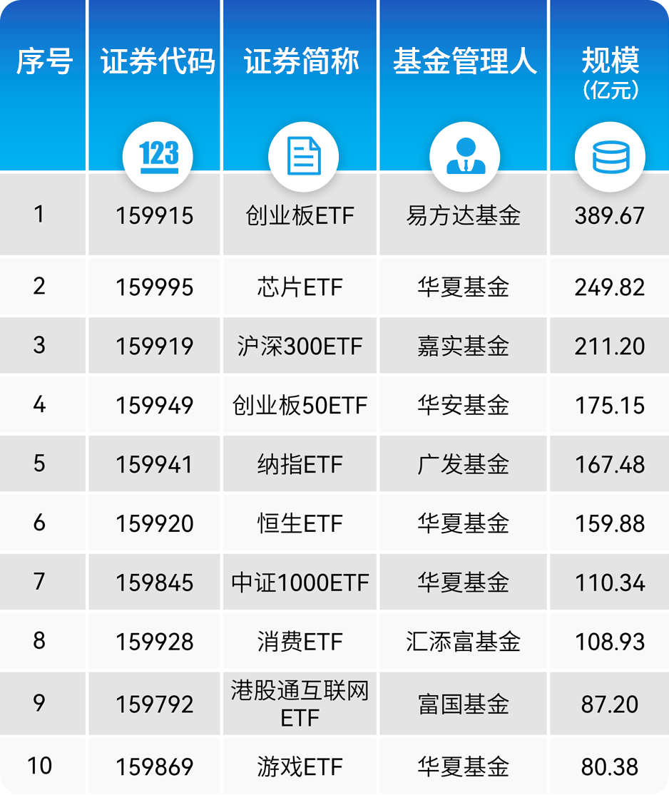 与此同时,规模前十榜单中还有多只ETF规模环比增长,其中包括沪深300ETF、创业板50ETF、纳指ETF、消费ETF、港股通互联网ETF和游戏ETF。