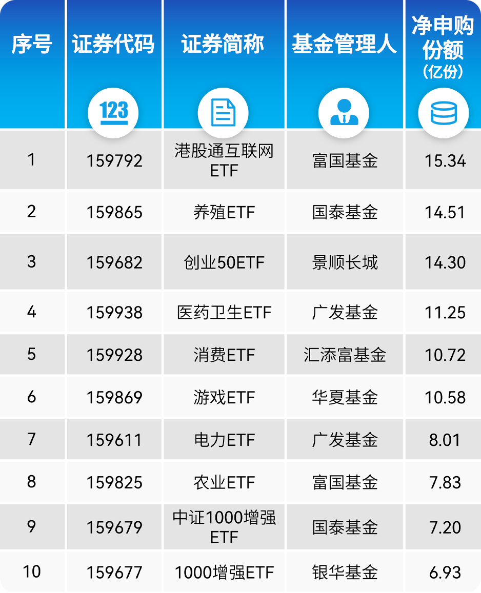 深交所净申购份额排名前十ETF产品中,6月净申购份额最大的3只ETF分别为港股通互联网ETF、养殖ETF、创业50ETF,净申购份额分别为15.34亿份、14.51亿份和14.30亿份。
