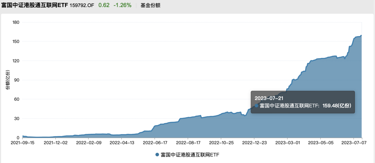 自去年10月底以来,港股市场不断走强,互联网科技板块涨势如虹,投资者配置热情明显提升,港股通互联网ETF的份额也一飙再飙,截至7月21日已经飙至159.48亿份,而去年同期不过只有23.92亿份。