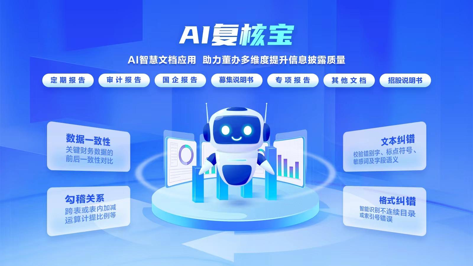 这是一款基于AI技术的智慧文档复核工具。它能够识别并提取公告中的关键信息,对数据进行一致性校验、勾稽关系校验、文本纠错和格式纠错等操作,从而确保上市公司信息披露的准确性和规范性。这款工具的引入将大大提升董办工作效率和信息披露质量。