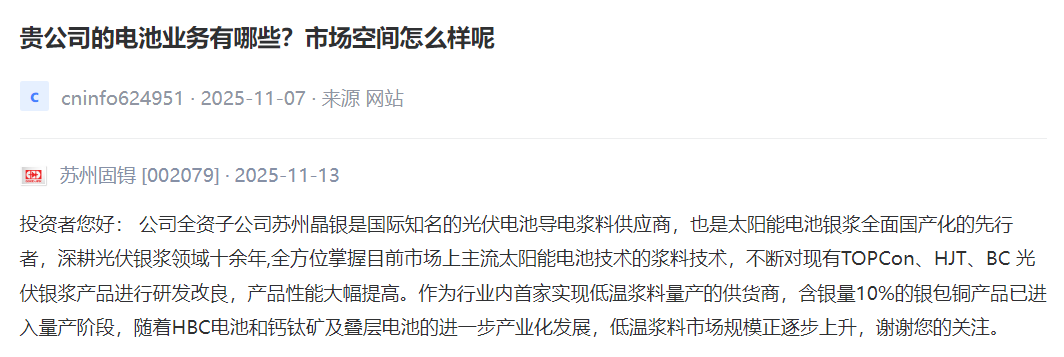 苏州固锝 [002079] :公司全资子公司苏州晶银是国际知名的光伏电池导电浆料供应商,也是太阳能电池银浆全面国产化的先行者,深耕光伏银浆领域十余年,全方位掌握目前市场上主流太阳能电池技术的浆料技术,不断对现有TOPCon、HJT、BC 光伏银浆产品进行研发改良,产品性能大幅提高。作为行业内首家实现低温浆料量产的供货商,含银量10%的银包铜产品已进入量产阶段,随着HBC电池和钙钛矿及叠层电池的进一步产业化发展,低温浆料市场规模正逐步上升。