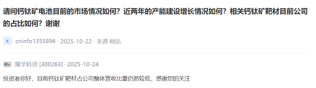 隆华科技 [300263] :目前钙钛矿靶材占公司整体营收比重仍然较低。