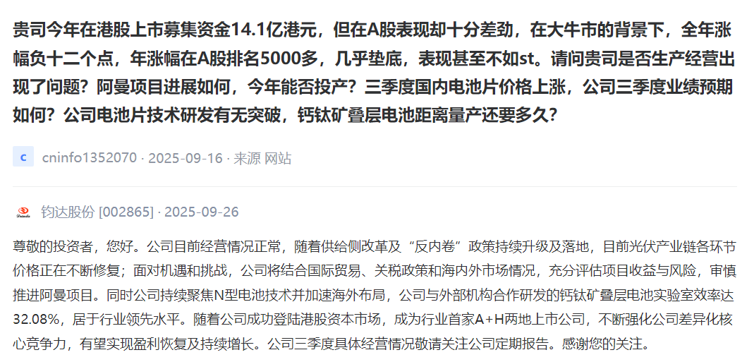 贵司今年在港股上市募集资金14.1亿港元,但在A股表现却十分差劲,在大牛市的背景下,全年涨幅负十二个点,年涨幅在A股排名5000多,几乎垫底,表现甚至不如st。请问贵司是否生产经营出现了问题?阿曼项目进展如何,今年能否投产?三季度国内电池片价格上涨,公司三季度业绩预期如何?公司电池片技术研发有无突破,钙钛矿叠层电池距离量产还要多久?