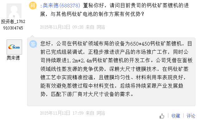 奥来德 [688378] :公司在钙钛矿领域布局的设备为650*450钙钛矿蒸镀机,目前已完成组装调试,正稳步推进该产品的市场推广工作,同时公司持续跟进1.2m*2.4m钙钛矿蒸镀机的开发工作。公司凭借在面板领域线性蒸发源的竞争优势,深耕大尺寸镀膜技术,在钙钛矿蒸镀工艺中实现精准控温,且镀膜均匀性、材料利用率表现良好,能有效避免蒸镀过程中材料变性,后续将持续紧跟产业发展趋势,匹配下游厂商对大尺寸设备的需求。