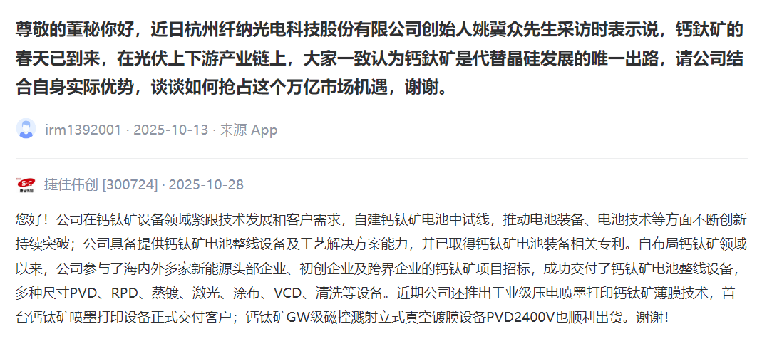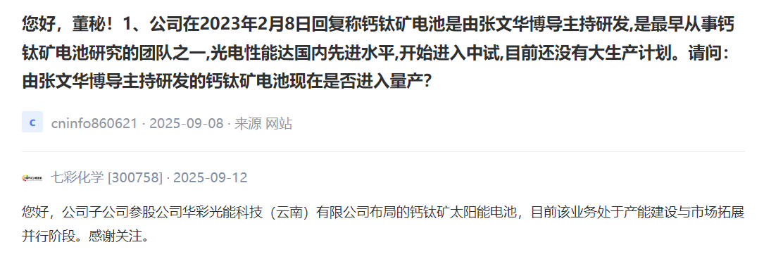 上述突破让钙钛矿电池从“实验室新贵”迈向“产业新赛道”。产业发展带动相关公司股价的波动,投资者提高了对钙钛矿领域发展的关注,在互动平台上对上市公司频繁提问,全景为您精选来自上市公司最真实的声音。(以下内容均摘自深交所互动易、上证e互动、上市公司公告等)