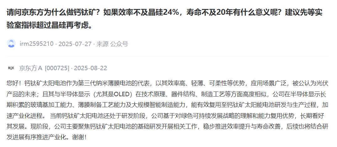 京东方为什么做钙钛矿?如果效率不及晶硅24%,寿命不及20年有什么意义呢?建议先等实验室指标超过晶硅再考虑。