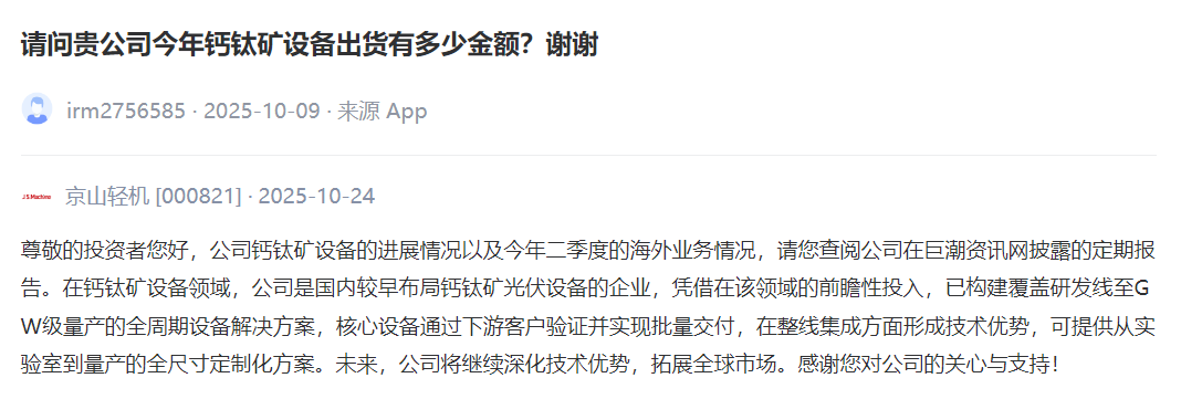 京山轻机 [000821] :公司钙钛矿设备的进展情况以及今年二季度的海外业务情况,请您查阅公司在巨潮资讯网披露的定期报告。在钙钛矿设备领域,公司是国内较早布局钙钛矿光伏设备的企业,凭借在该领域的前瞻性投入,已构建覆盖研发线至GW级量产的全周期设备解决方案,核心设备通过下游客户验证并实现批量交付,在整线集成方面形成技术优势,可提供从实验室到量产的全尺寸定制化方案。未来,公司将继续深化技术优势,拓展全球市场。