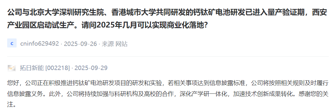 拓日新能 [002218] :公司正在积极推进钙钛矿电池研发项目的研发和实验,若相关事项达到信息披露标准,公司将按照相关规则及时履行信息披露义务。此外,公司将持续加强与科研机构及高校的合作,深化产学研一体化,加速技术创新成果转化。