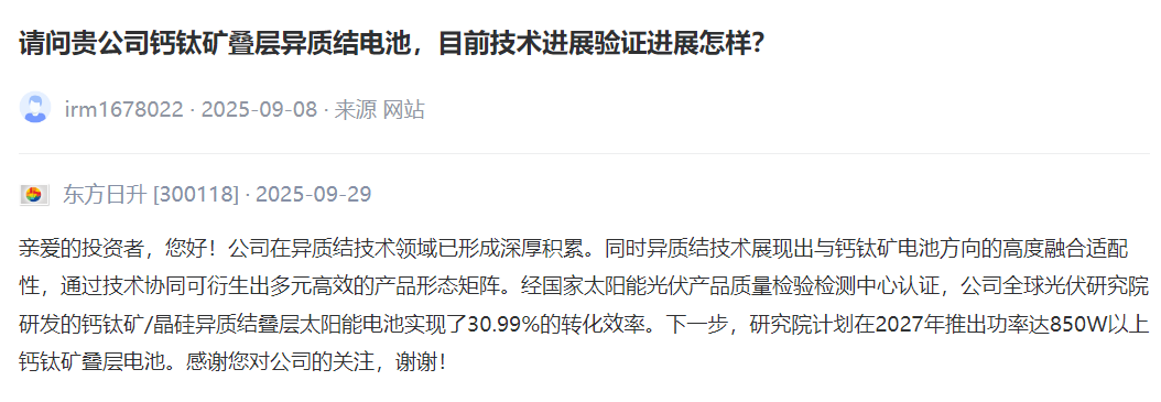 东方日升 [300118] :公司在异质结技术领域已形成深厚积累。同时异质结技术展现出与钙钛矿电池方向的高度融合适配性,通过技术协同可衍生出多元高效的产品形态矩阵。经国家太阳能光伏产品质量检验检测中心认证,公司全球光伏研究院研发的钙钛矿/晶硅异质结叠层太阳能电池实现了30.99%的转化效率。下一步,研究院计划在2027年推出功率达850W以上钙钛矿叠层电池。