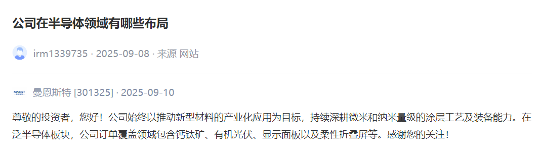 曼恩斯特[301325] :公司始终以推动新型材料的产业化应用为目标,持续深耕微米和纳米量级的涂层工艺及装备能力。在泛半导体板块,公司订单覆盖领域包含钙钛矿、有机光伏、显示面板以及柔性折叠屏等。