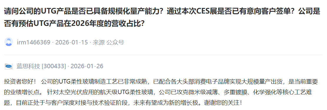 蓝思科技 [300433] :公司的UTG柔性玻璃制造工艺已非常成熟,已配合各大头部消费电子品牌实现大规模量产出货,是当前重要的业绩增长点。 针对太空光伏应用的航天级UTG柔性玻璃,公司已攻克微米级减薄、多重镀膜、化学强化等核心工艺难题,目前正处于与客户深度对接与技术验证阶段,未来有望成为新的增长极。