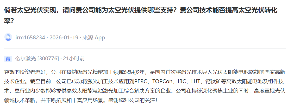 倘若太空光伏实现,请问贵公司能为太空光伏提供哪些支持?贵公司技术能否提高太空光伏转化率?