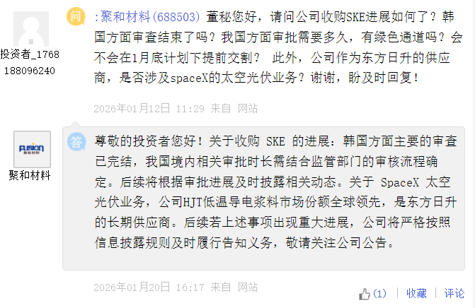 聚和材料 [688503] :关于 SpaceX 太空光伏业务,公司HJT低温导电浆料市场份额全球领先,是东方日升的长期供应商。后续若上述事项出现重大进展,公司将严格按照信息披露规则及时履行告知义务,敬请关注公司公告。