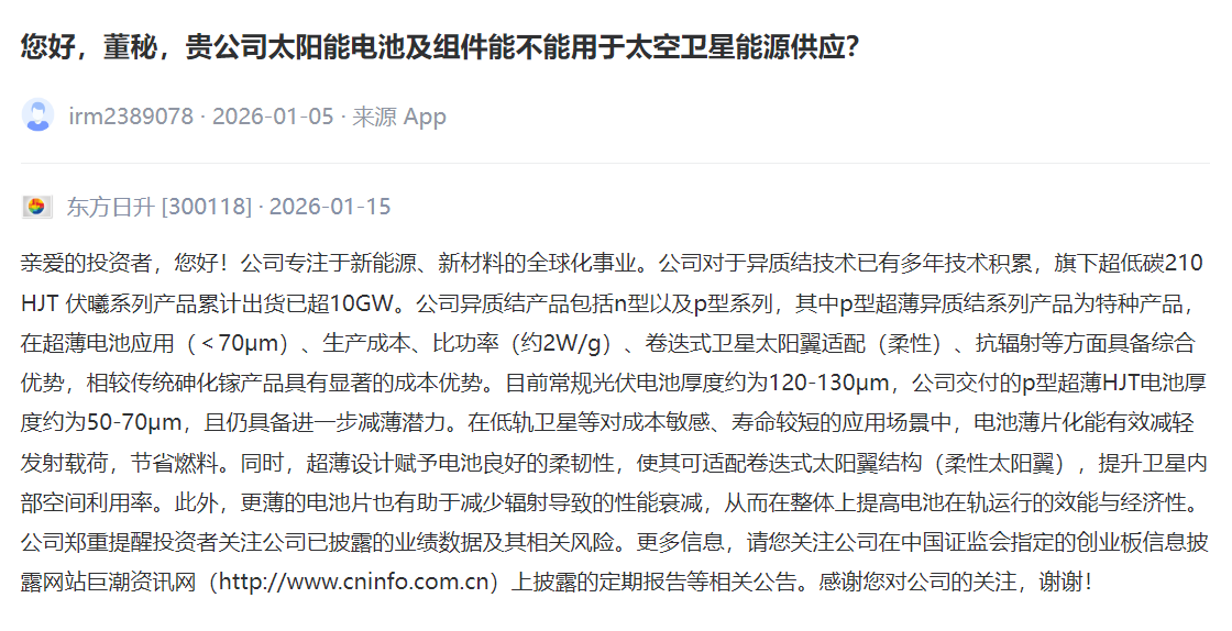 东方日升 [300118] :公司专注于新能源、新材料的全球化事业。公司对于异质结技术已有多年技术积累,旗下超低碳210 HJT 伏曦系列产品累计出货已超10GW。公司异质结产品包括n型以及p型系列,其中p型超薄异质结系列产品为特种产品,在超薄电池应用(<70μm)、生产成本、比功率(约2W/g)、卷迭式卫星太阳翼适配(柔性)、抗辐射等方面具备综合优势,相较传统砷化镓产品具有显著的成本优势。目前常规光伏电池厚度约为120-130μm,公司交付的p型超薄HJT电池厚度约为50-70μm,且仍具备进一步减薄潜力。在低轨卫星等对成本敏感、寿命较短的应用场景中,电池薄片化能有效减轻发射载荷,节省燃料。同时,超薄设计赋予电池良好的柔韧性,使其可适配卷迭式太阳翼结构(柔性太阳翼),提升卫星内部空间利用率。此外,更薄的电池片也有助于减少辐射导致的性能衰减,从而在整体上提高电池在轨运行的效能与经济性。