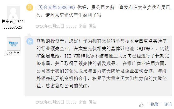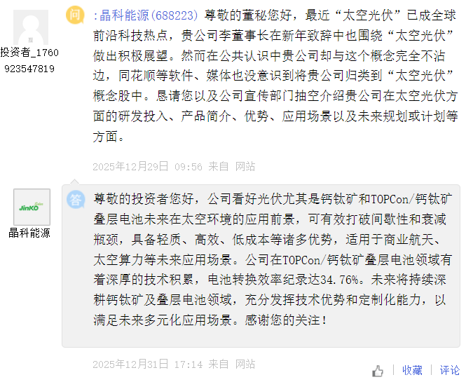 晶科能源 [688223] :公司看好光伏尤其是钙钛矿和TOPCon/钙钛矿叠层电池未来在太空环境的应用前景,可有效打破间歇性和衰减瓶颈,具备轻质、高效、低成本等诸多优势,适用于商业航天、太空算力等未来应用场景。公司在TOPCon/钙钛矿叠层电池领域有着深厚的技术积累,电池转换效率纪录达34.76%。未来将持续深耕钙钛矿及叠层电池领域,充分发挥技术优势和定制化能力,以满足未来多元化应用场景。