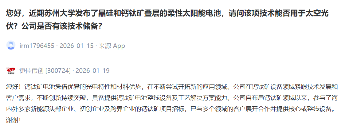 捷佳伟创 [300724] :钙钛矿电池凭借优异的光电特性和材料优势,在不断尝试开拓新的应用领域。公司在钙钛矿设备领域紧跟技术发展和客户需求,不断创新持续突破,具备提供钙钛矿电池整线设备及工艺解决方案能力。公司自布局钙钛矿领域以来,参与了海内外多家新能源头部企业、初创企业及跨界企业的钙钛矿项目招标,已与多个领域的客户展开合作并提供核心或整线设备。