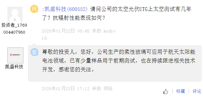 凯盛科技 [600552] :公司生产的柔性玻璃可应用于航天太阳能电池领域,已有少量样品用于前期测试,也在持续跟进相关技术开发。