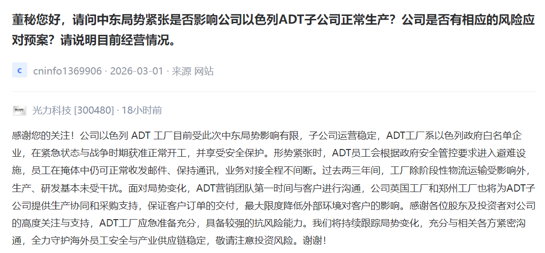 光力科技 [300480] :公司以色列ADT工厂目前受此次中东局势影响有限,子公司运营稳定,ADT工厂系以色列政府白名单企业,在紧急状态与战争时期获准正常开工,并享受安全保护。形势紧张时,ADT员工会根据政府安全管控要求进入避难设施,员工在掩体中仍可正常收发邮件、保持通讯,业务对接全程不间断。过去两三年间,工厂除阶段性物流运输受影响外,生产、研发基本未受干扰。面对局势变化,ADT营销团队第一时间与客户进行沟通,公司英国工厂和郑州工厂也将为ADT子公司提供生产协同和采购支持,保证客户订单的交付,最大限度降低外部环境对客户的影响。感谢各位股东及投资者对公司的高度关注与支持,ADT工厂应急准备充分,具备较强的抗风险能力。我们将持续跟踪局势变化,充分与相关各方紧密沟通,全力守护海外员工安全与产业供应链稳定,敬请注意投资风险。