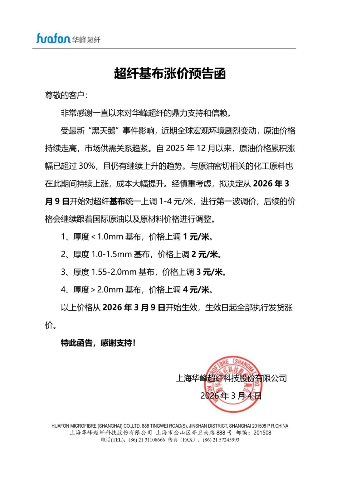 华峰超纤 [300180] :受最新“黑天鹅”事件影响,近期全球宏观环境剧烈变动,原油价格持续走高,市场供需关系趋紧。自2025年12月以来,原油价格累积涨幅已超过30%,且仍有继续上升的趋势。与原油密切相关的化工原料也在此期间持续上涨,成本大幅提升。经慎重考虑,拟决定从2026年3月9日开始对超纤基布统一上调1元-4元/米,进行第一波调价,后续的价格会继续跟着国际原油以及原材料价格进行调整。