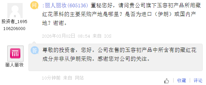 丽人丽妆 [605136] :公司在售的玉容初产品中所含有的藏红花成分并非从伊朗采购。