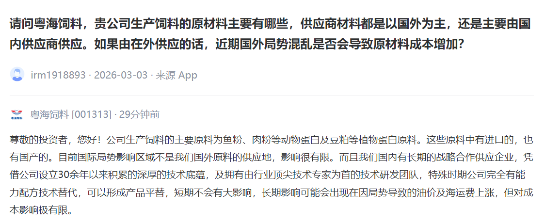 粤海饲料 [001313] :公司生产饲料的主要原料为鱼粉、肉粉等动物蛋白及豆粕等植物蛋白原料。这些原料中有进口的,也有国产的。目前国际局势影响区域不是我们国外原料的供应地,影响很有限。而且我们国内有长期的战略合作供应企业,凭借公司设立30余年以来积累的深厚的技术底蕴,及拥有由行业顶尖技术专家为首的技术研发团队,特殊时期公司完全有能力配方技术替代,可以形成产品平替,短期不会有大影响,长期影响可能会出现在因局势导致的油价及海运费上涨,但对成本影响极有限。