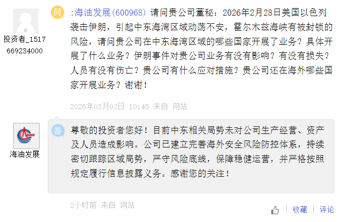 海油发展 [600968] :目前中东相关局势未对公司生产经营、资产及人员造成影响。公司已建立完善海外安全风险防控体系,持续密切跟踪区域局势,严守风险底线,保障稳健运营,并严格按照规定履行信息披露义务。