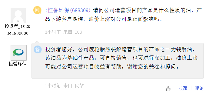 恒誉环保 [688309] :公司废轮胎热裂解运营项目的产品之一为裂解油,该油品为基础性产品,可直接销售,也可进行深加工,油价上涨可能对公司运营项目收益有帮助。