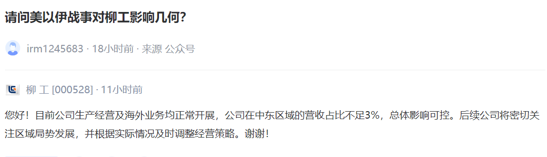 柳工 [000528] :目前公司生产经营及海外业务均正常开展,公司在中东区域的营收占比不足3%,总体影响可控。后续公司将密切关注区域局势发展,并根据实际情况及时调整经营策略。