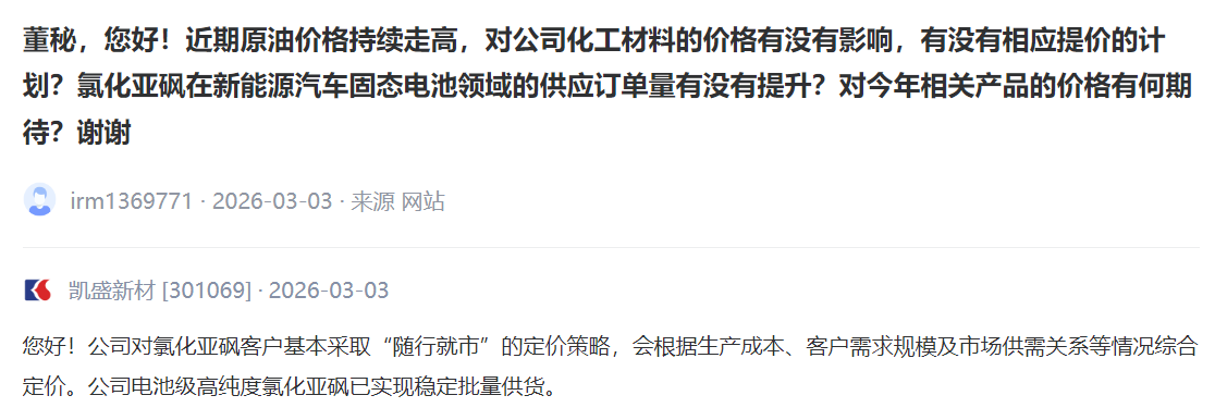 近期原油价格持续走高,对公司化工材料的价格有没有影响,有没有相应提价的计划?氯化亚砜在新能源汽车固态电池领域的供应订单量有没有提升?对今年相关产品的价格有何期待?