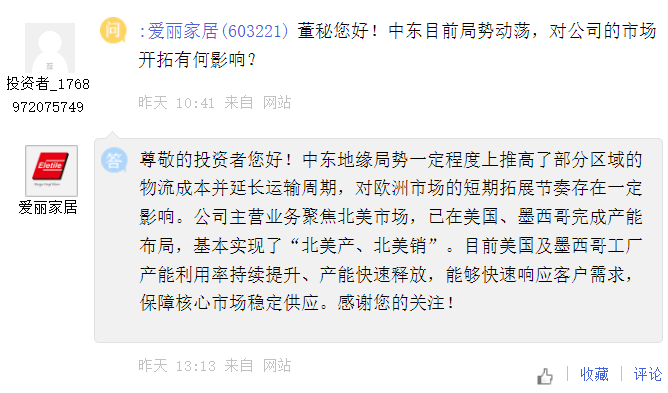 爱丽家居 [603221] :中东地缘局势一定程度上推高了部分区域的物流成本并延长运输周期,对欧洲市场的短期拓展节奏存在一定影响。公司主营业务聚焦北美市场,已在美国、墨西哥完成产能布局,基本实现了“北美产、北美销”。目前美国及墨西哥工厂产能利用率持续提升、产能快速释放,能够快速响应客户需求,保障核心市场稳定供应。