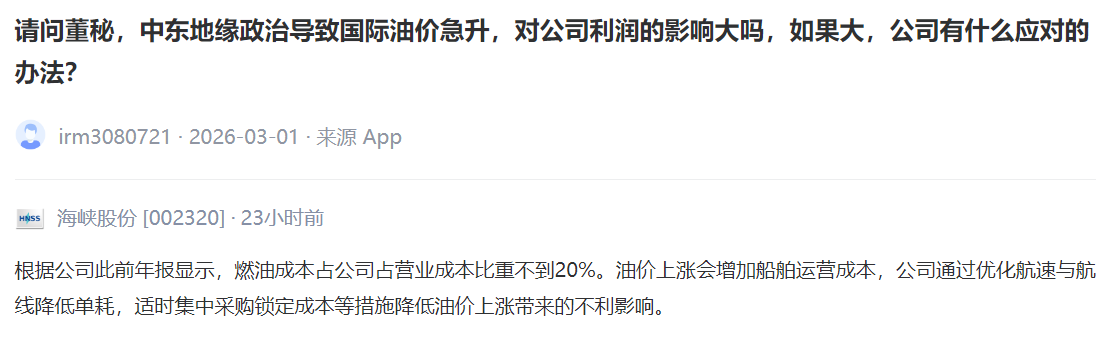 海峡股份 [002320] :根据公司此前年报显示,燃油成本占公司占营业成本比重不到20%。油价上涨会增加船舶运营成本,公司通过优化航速与航线降低单耗,适时集中采购锁定成本等措施降低油价上涨带来的不利影响。