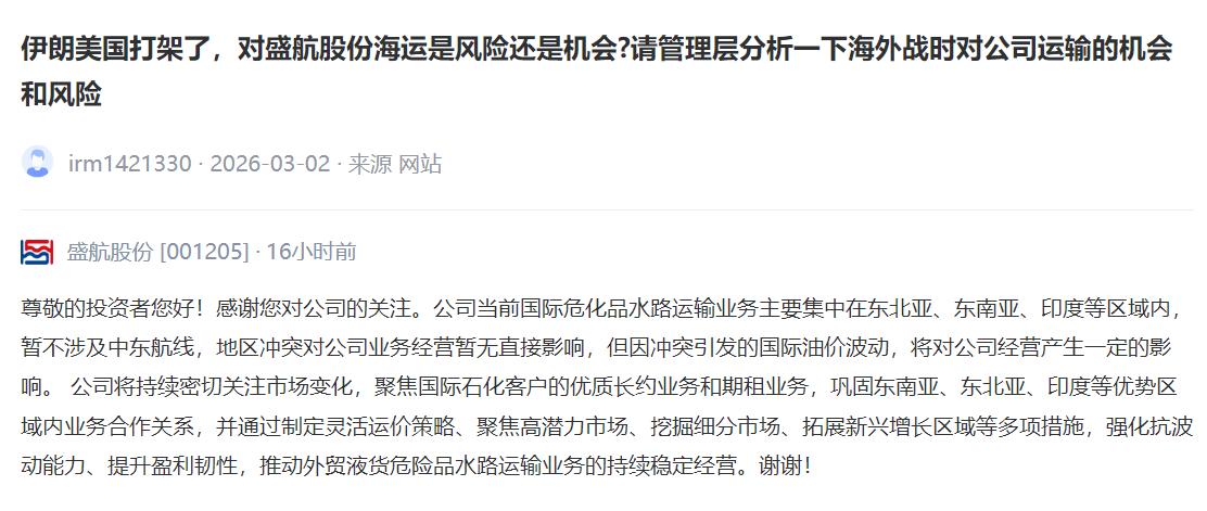 盛航股份 [001205] :公司当前国际危化品水路运输业务主要集中在东北亚、东南亚、印度等区域内,暂不涉及中东航线,地区冲突对公司业务经营暂无直接影响,但因冲突引发的国际油价波动,将对公司经营产生一定的影响。 公司将持续密切关注市场变化,聚焦国际石化客户的优质长约业务和期租业务,巩固东南亚、东北亚、印度等优势区域内业务合作关系,并通过制定灵活运价策略、聚焦高潜力市场、挖掘细分市场、拓展新兴增长区域等多项措施,强化抗波动能力、提升盈利韧性,推动外贸液货危险品水路运输业务的持续稳定经营。