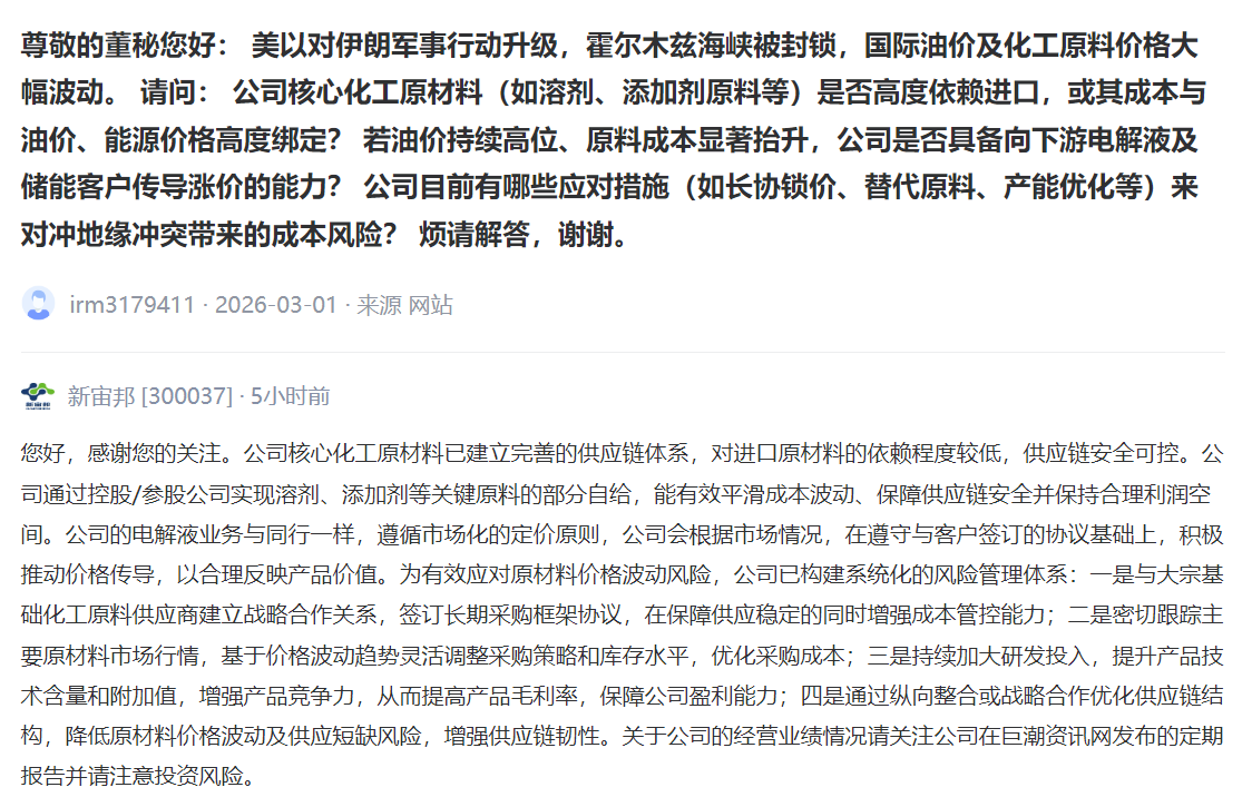 美以对伊朗军事行动升级,霍尔木兹海峡被封锁,国际油价及化工原料价格大幅波动。 请问: 公司核心化工原材料(如溶剂、添加剂原料等)是否高度依赖进口,或其成本与油价、能源价格高度绑定? 若油价持续高位、原料成本显著抬升,公司是否具备向下游电解液及储能客户传导涨价的能力? 公司目前有哪些应对措施(如长协锁价、替代原料、产能优化等)来对冲地缘冲突带来的成本风险?