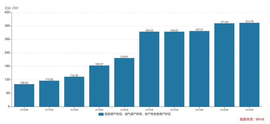 2025年公司折旧总额为373.79亿元,看似绝对值很高,但近年数据对比:2016年到2021年,100.43亿增长到334.32亿,5年增长200%+,而2021年到2025年4年累积增长11.81%,增速显著放缓。