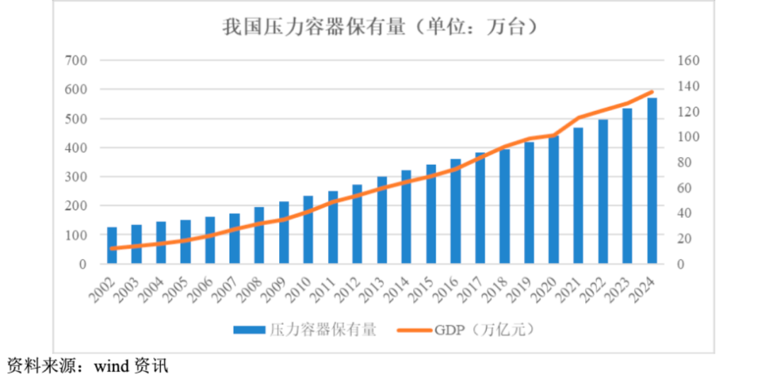 与此同时,煤化工、炼油及石油化工产业的高速发展,特别是“十三五”期间七大炼化一体化基地的建设和现代煤化工的高质量发展,为压力容器行业带来了巨大机遇,推动市场规模持续扩大。2002年至2024年,我国压力容器保有量从126.90万台增至571.63万台,年均复合增长率达7.08%,与国民经济发展呈现明显正相关。