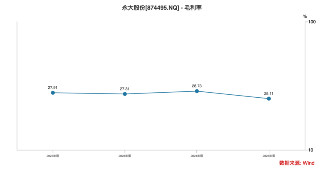 与此同时,公司2022—2025年毛利率分别为27.91%、27.31%、28.73%、25.11%,始终维持在较高水平位置,并且相较于2022—2024年可比公司均值的24.85%、23.73%、26.49%而言,永大股份具有一定优势。