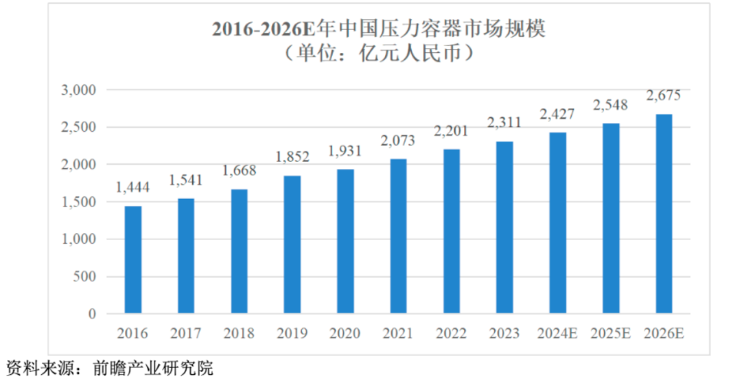根据前瞻产业研究院数据,我国压力容器的市场规模由2016年的1,444亿元增长至2023年的2,311亿元,期间实现年均复合增长率6.95%,2026年预计有望超过2,600亿元,压力容器行业市场发展潜力较大。