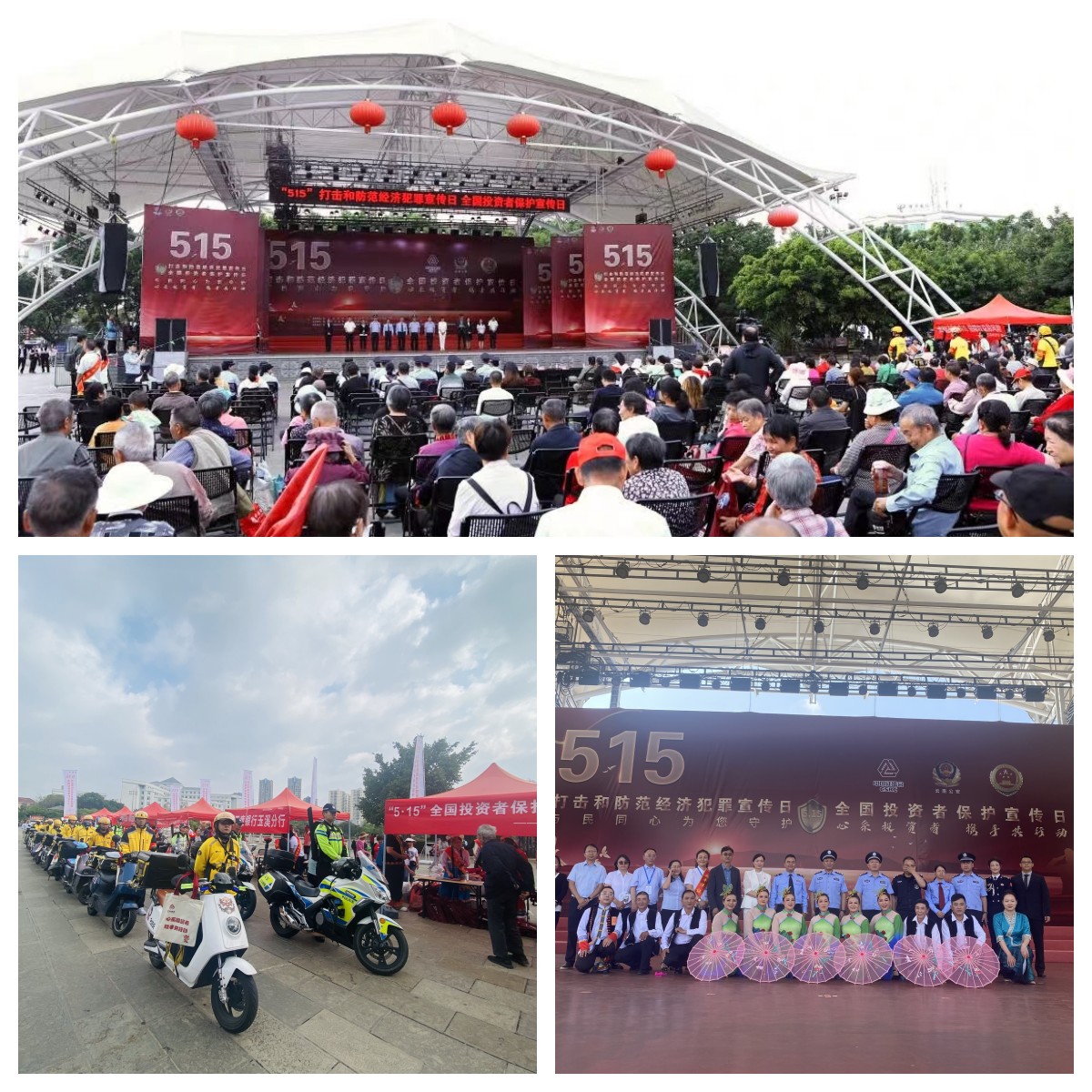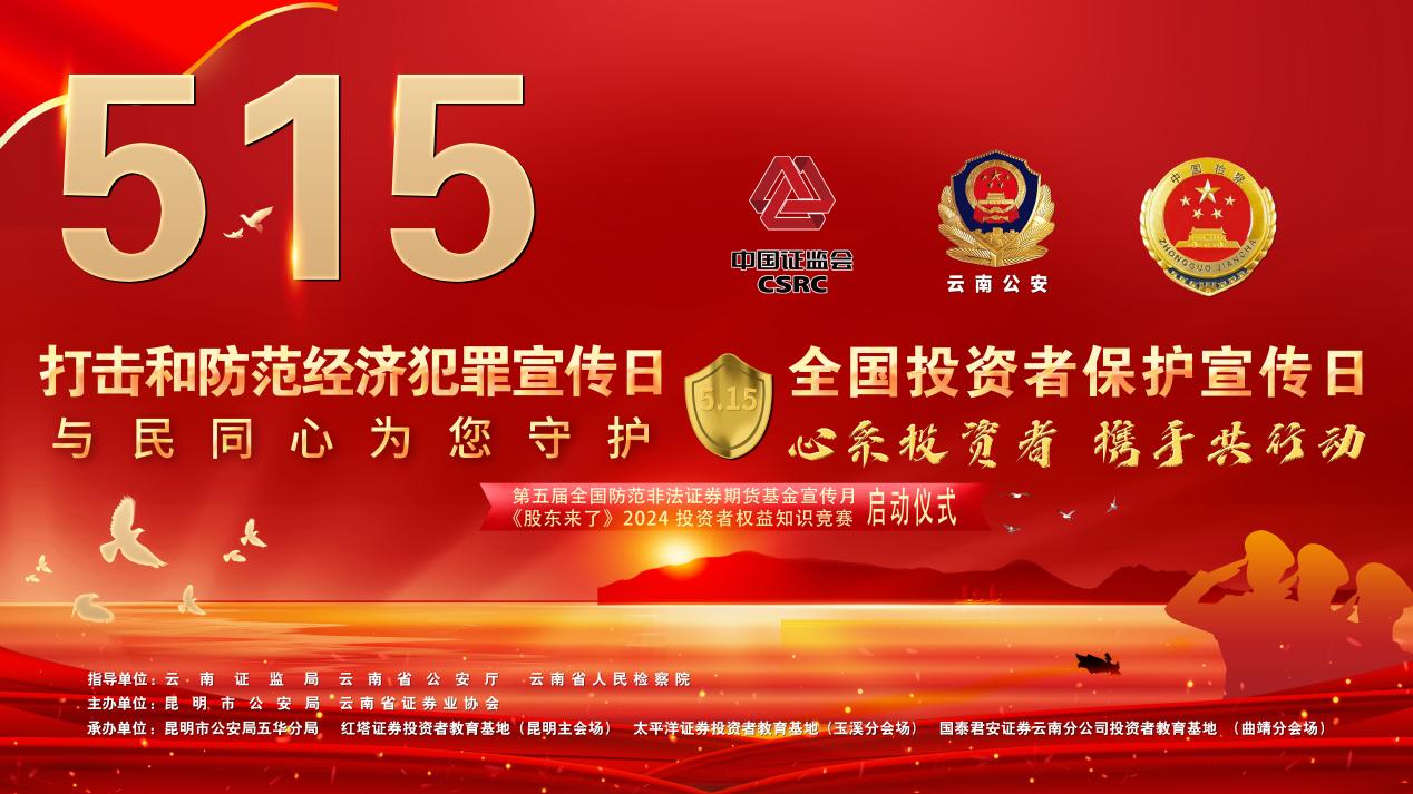 2024年5月15日,在中国证监会第6个“5·15全国投资者保护宣传日”和第15个“5·15全国公安机关打击和防范经济犯罪宣传日”之际,由云南证监局、云南省公安厅、云南省人民检察院联合举办的全省“5·15”宣传日启动仪式暨大型线下宣传活动在昆明市南屏步行街广场盛大举行。本次活动以“心系投资者携手共行动——推动高质量发展、提振投资者信心”和“与民同心为您守护 ”为主题,活动在曲靖市、玉溪市设立分会场。