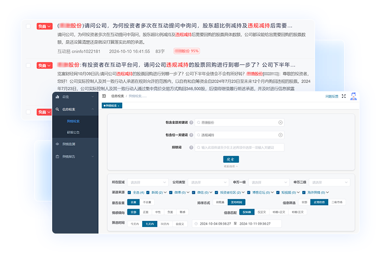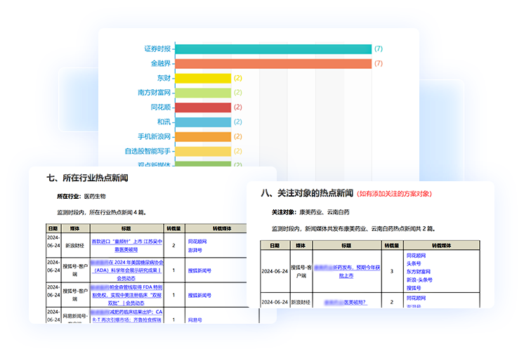 - 对用户及关注公司主体舆情=进行全网监测,定时生成舆情日报、周报、月报、季报,以PDF和word格式通过电子邮件发送,并在平台提供查看、下载