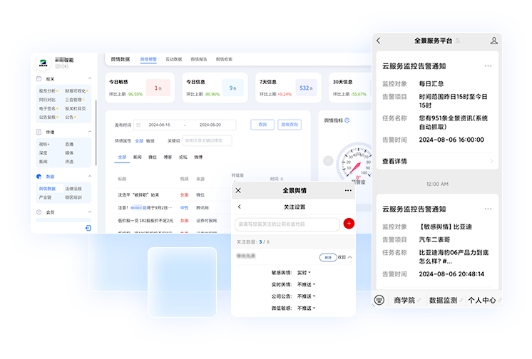 - 对用户及不超过6家关注公司主体的敏感新闻进行全网监测,支持用户自定义敏感词,通过微信公众号【全景服务平台】进行预警信息推送,并在平台提供预警信息查看